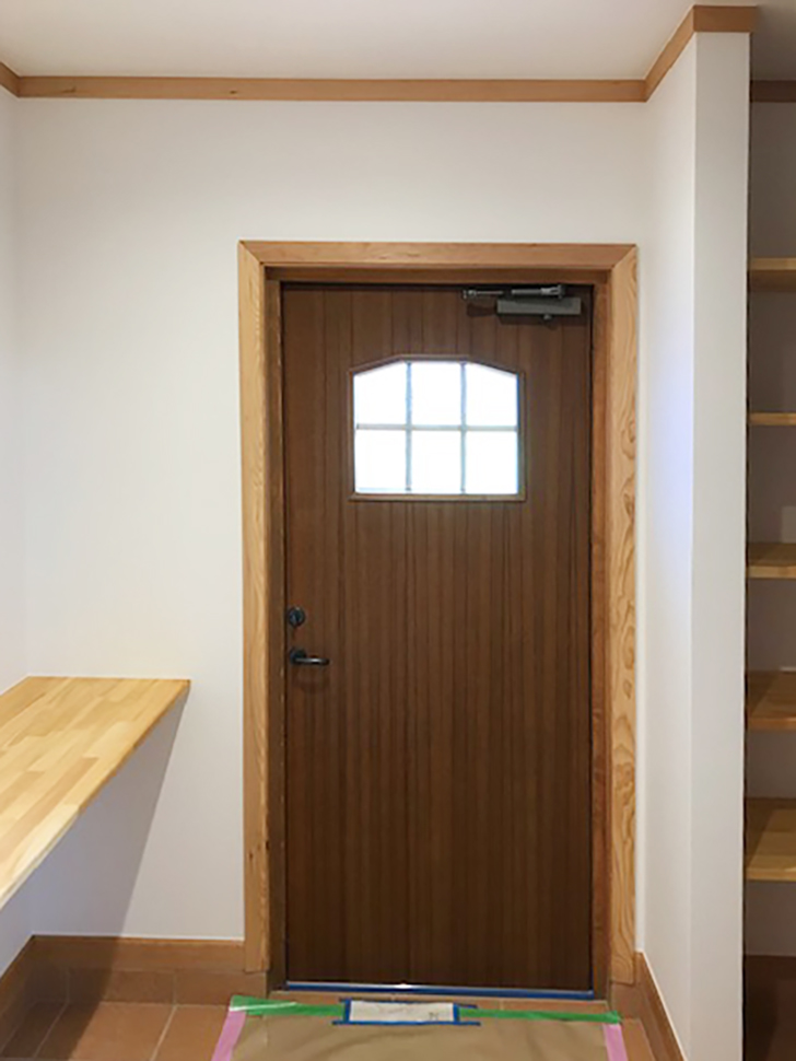 重厚感のある玄関ドアがアクセントに。