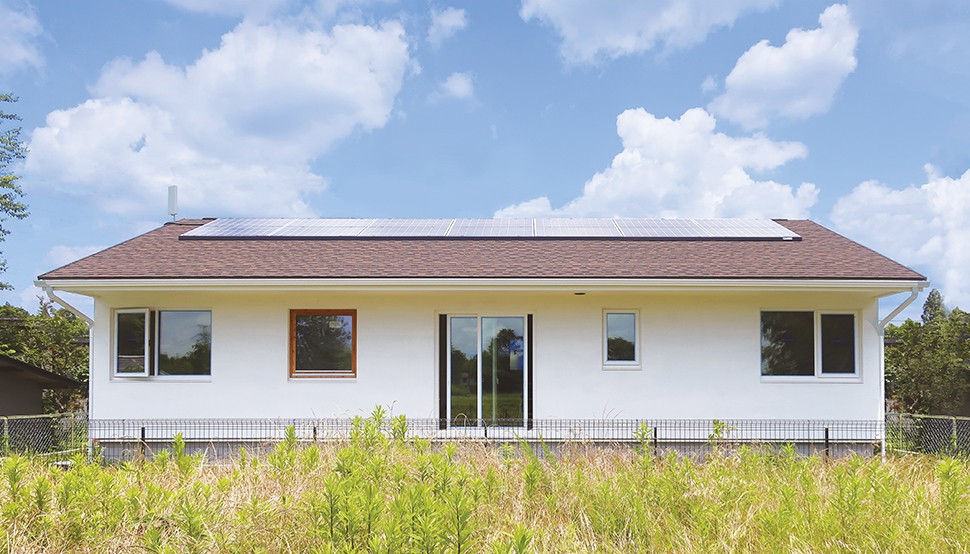 水平の屋根が青空に映える、自然素材たっぷりの平屋住宅の完成です。