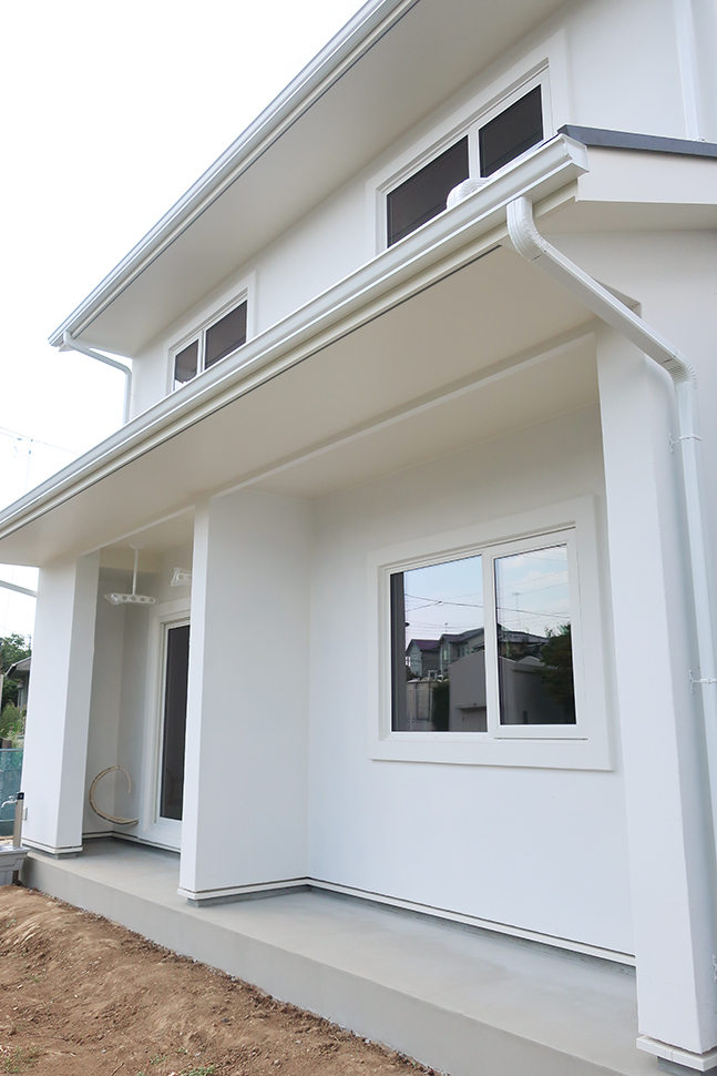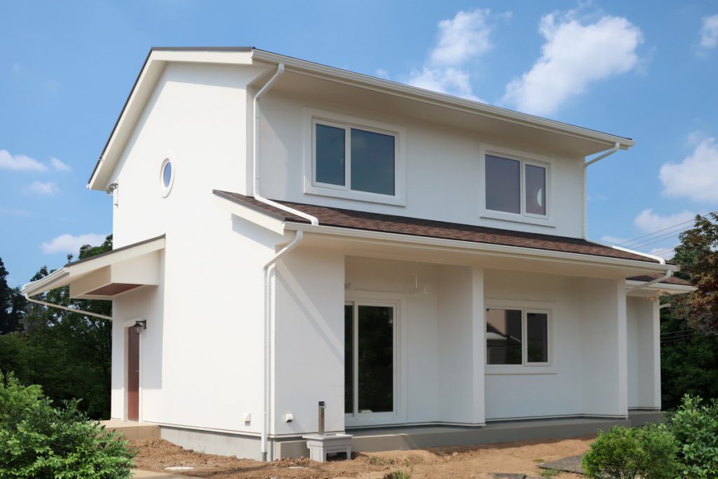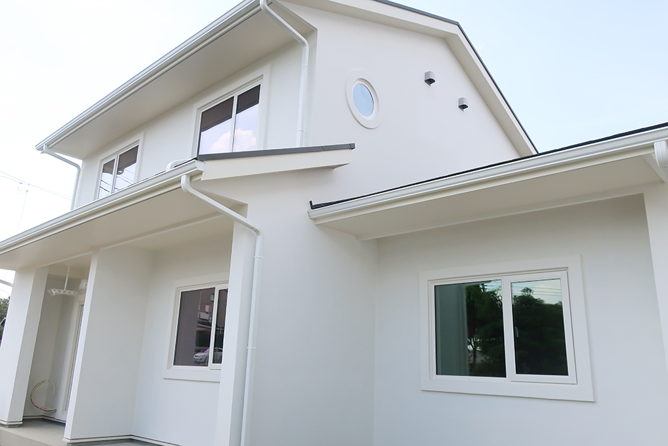 2階の丸い窓が特徴的な、美しい塗り壁の家が完成しました。