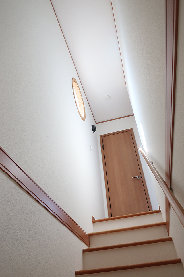 かわいい丸窓は、階段上部の明かり取りになっています。