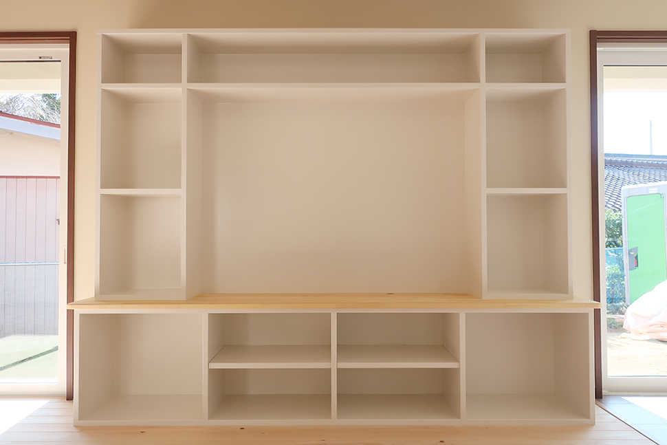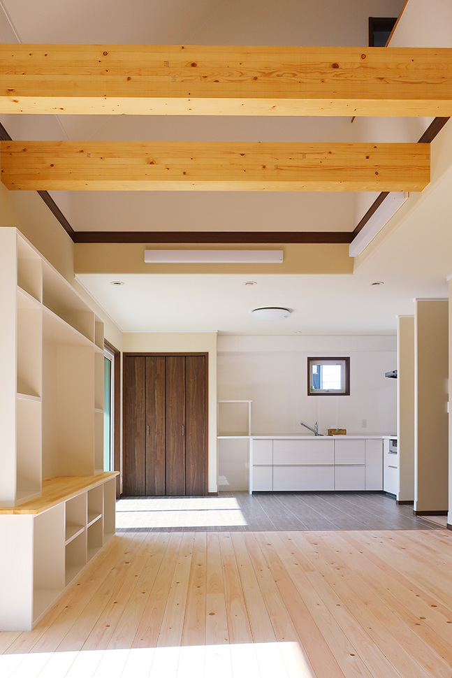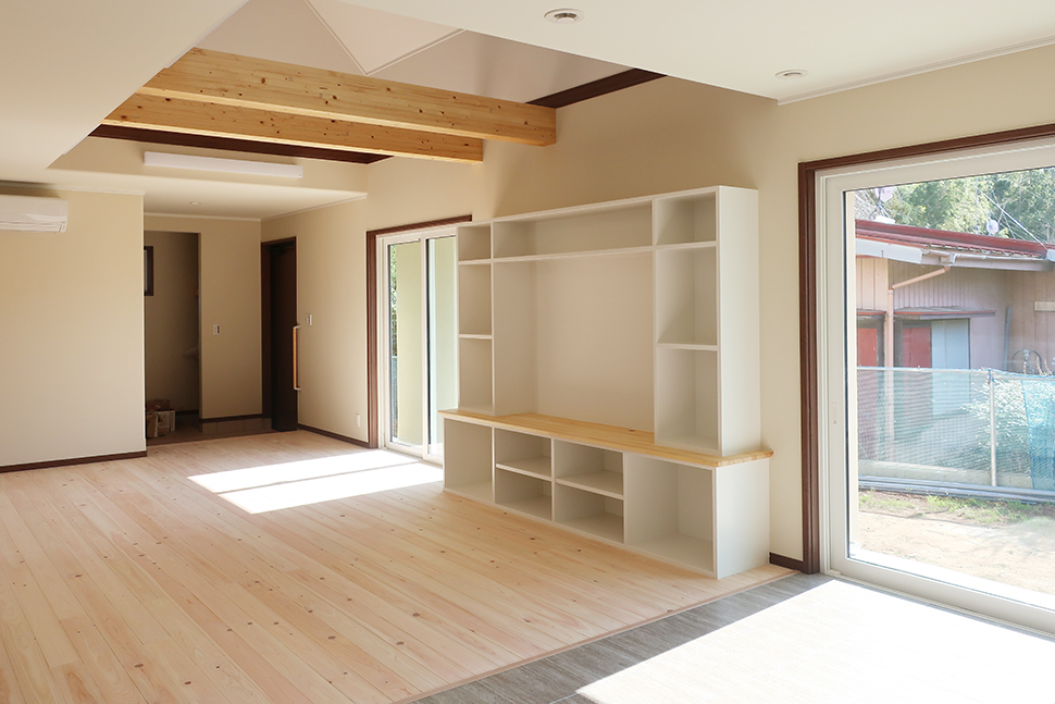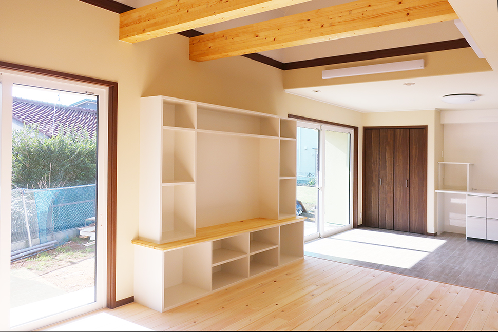吹き抜け空間を彩る梁と造り付けの大きなテレビボード、心地よい木の床。