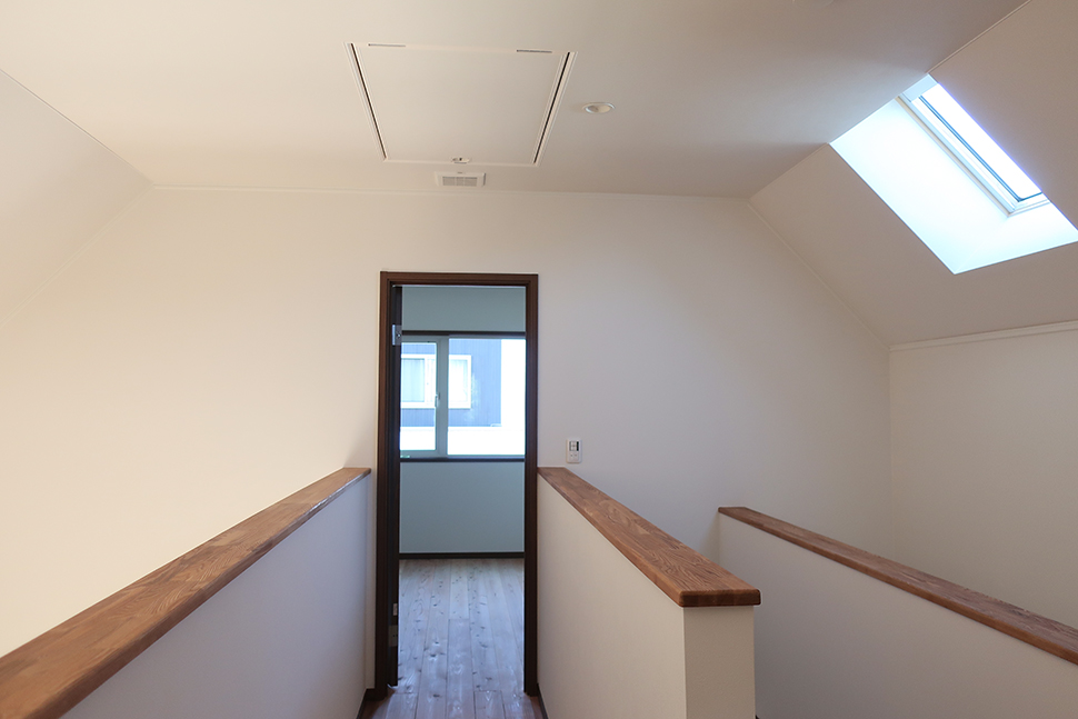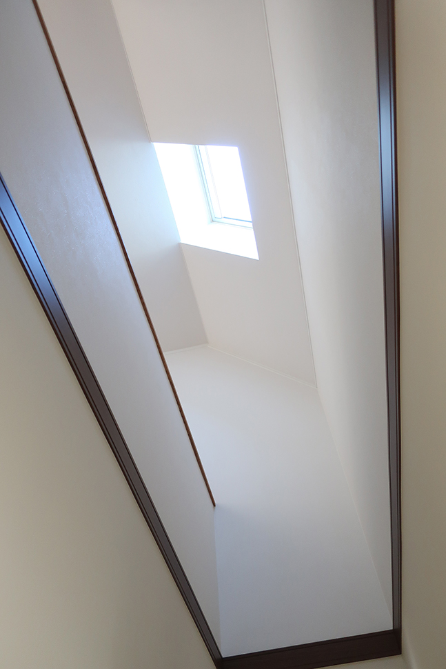 左右に吹き抜けのある階段は、天窓でさらに明るく。