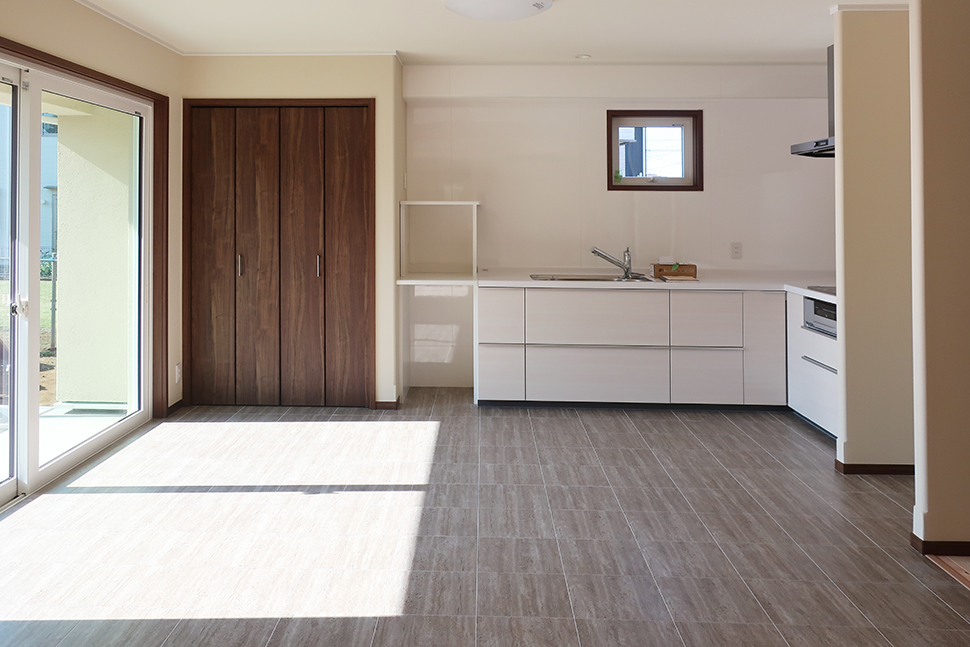 大きな窓と吹き抜けを配し、明るく開放的な空間のLDK