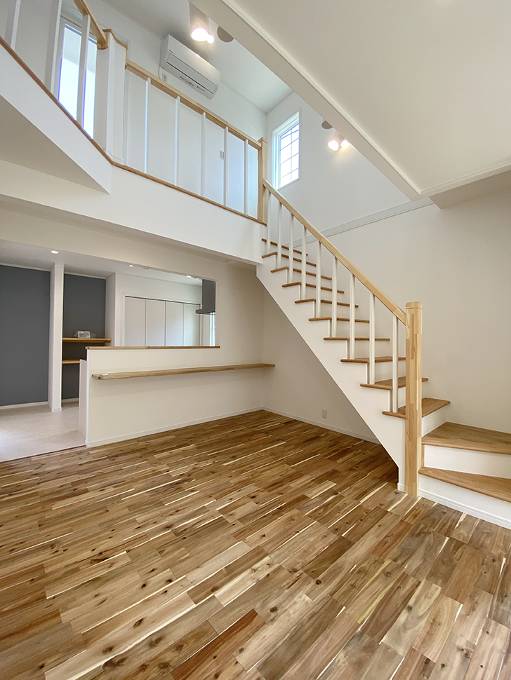 リビング階段と吹き抜けによる大空間が心地よいLDK。
