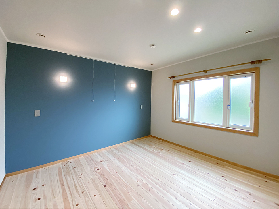 ピクチャーレール設置の壁には落ち着いた色味のクロスを貼りました。