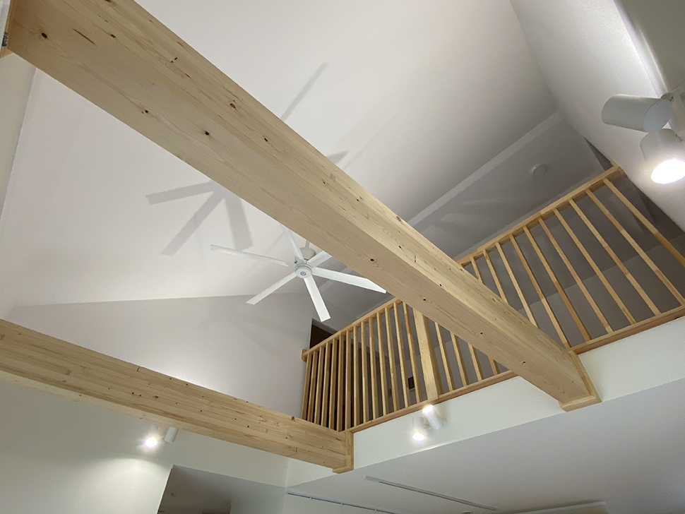 屋根形状を生かしたロフト付の吹き抜けが開放的なLDK。