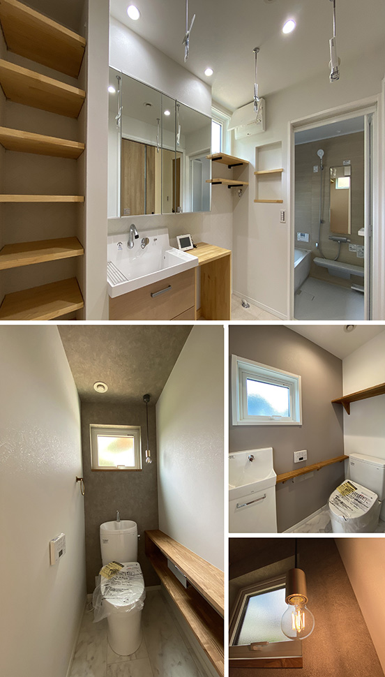 大きなクロゼットを備えた洗面室。 トイレはシンプルにまとめた癒し空間に。