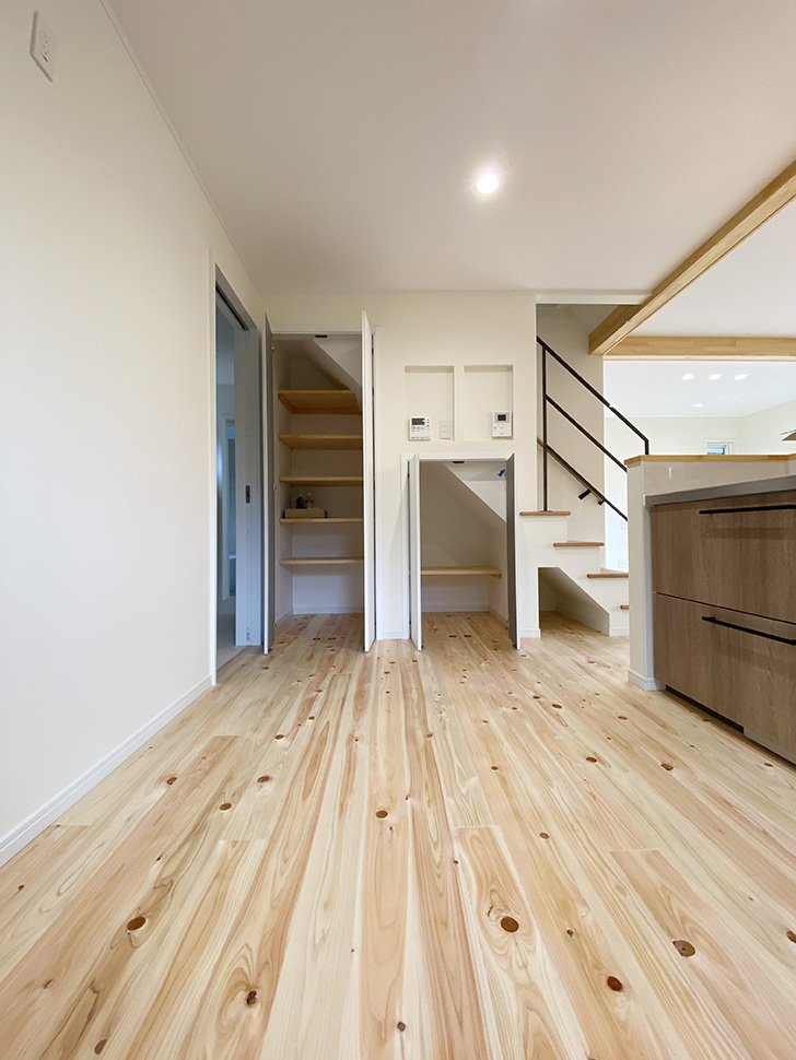広々としたキッチン。 階段下を利用した収納と、無駄のない水廻りへの動線。