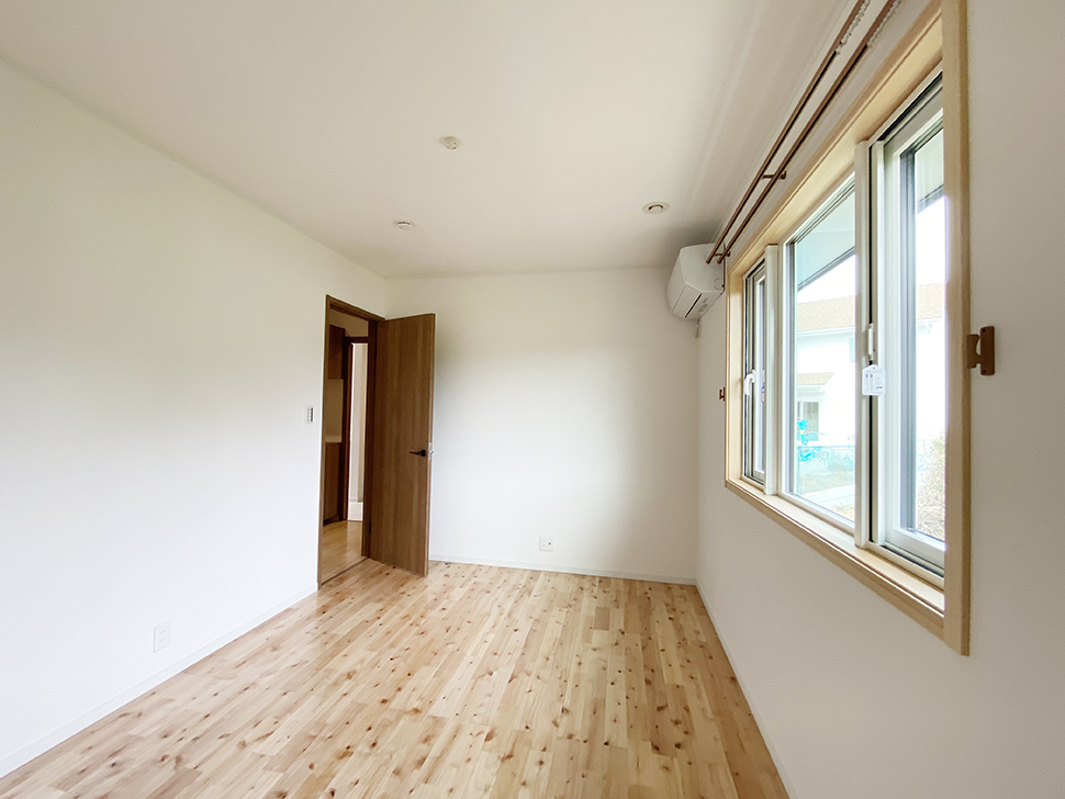 木製サッシと白い壁のコントラストが美しい居室。 もちろん、各部屋には広々とした収納を。