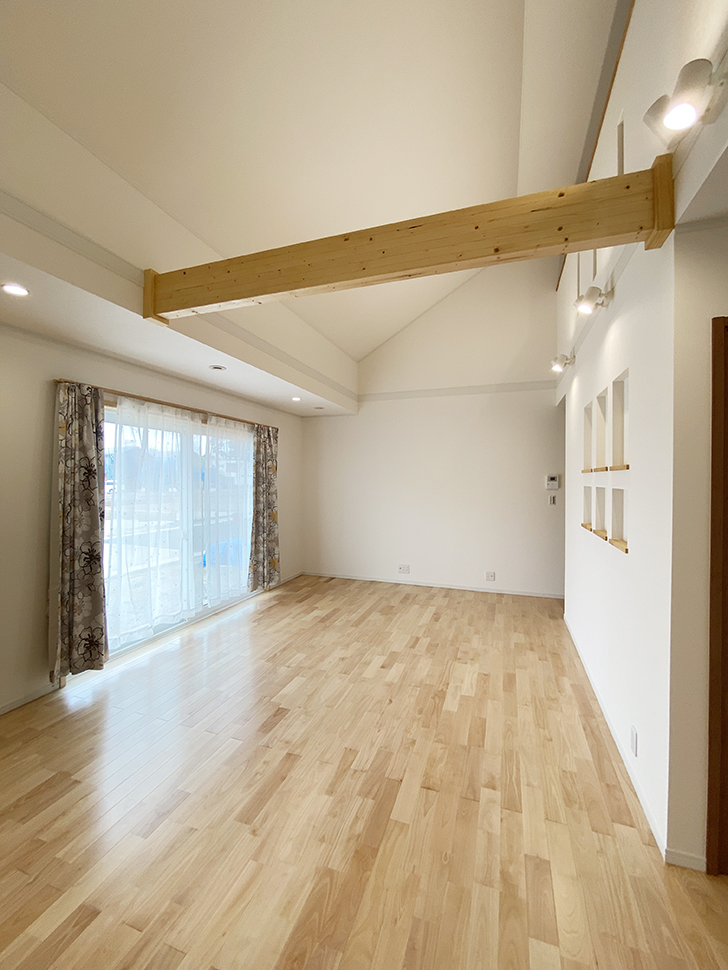 屋根形状を生かした高い天井、あらわしの梁。心地よい大空間が魅力の、日当たりの良いLDKです。