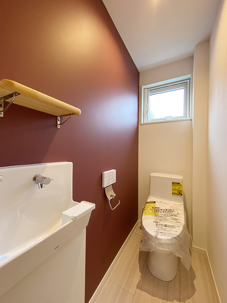 シンプルにまとめたお手洗いはクロスを貼り分けることで濃い色味も爽やかに溶け込みます。