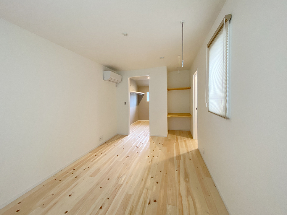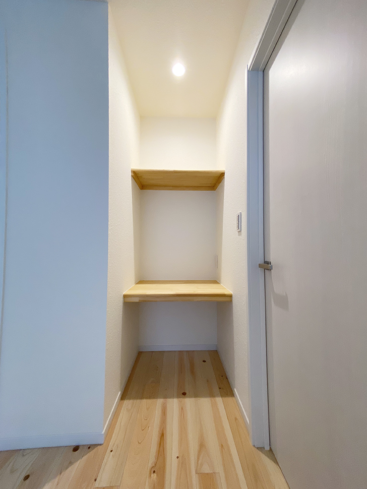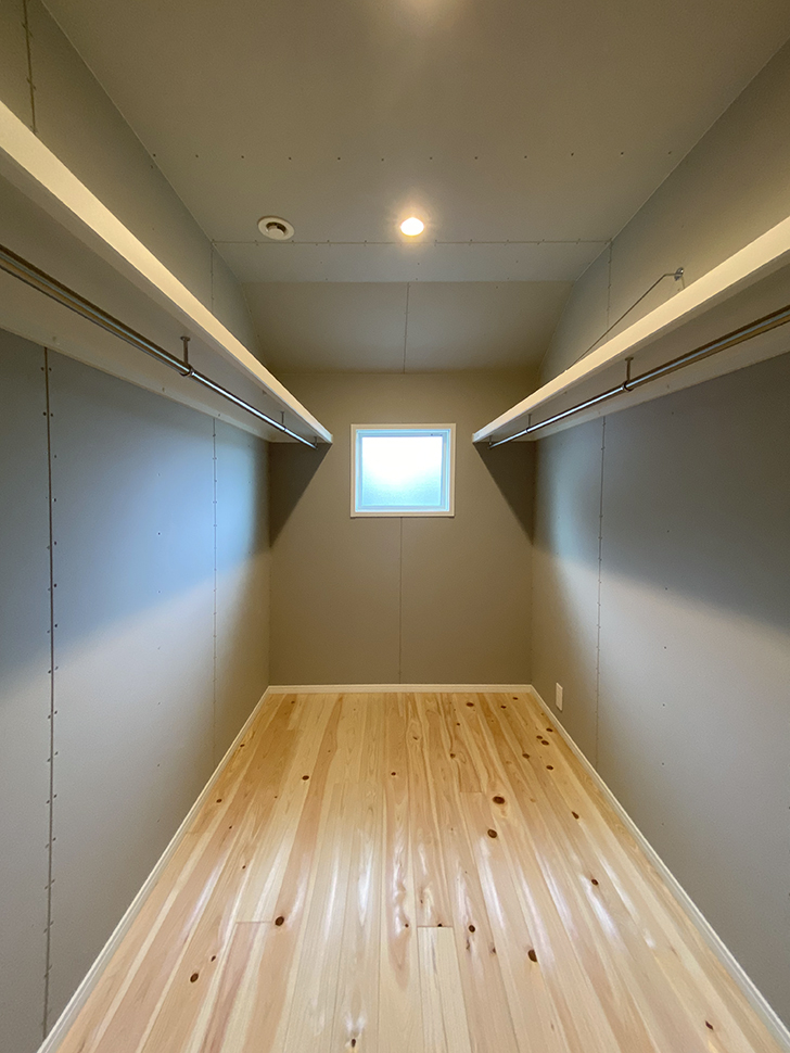 ウォークインクロゼットの壁には「ハイクリンスカットボード」(グレーのボード)を使用。