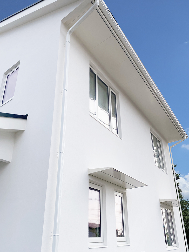 白壁が青空に映える、ダブル断熱で1年を通じて快適に過ごせるお家が完成しました。