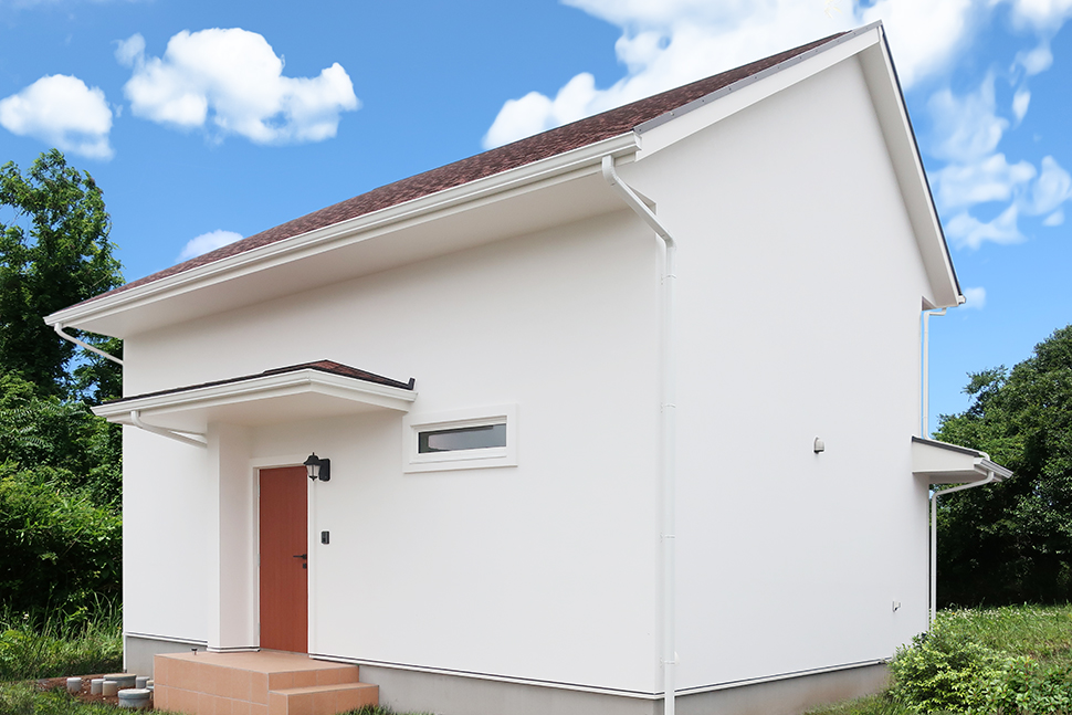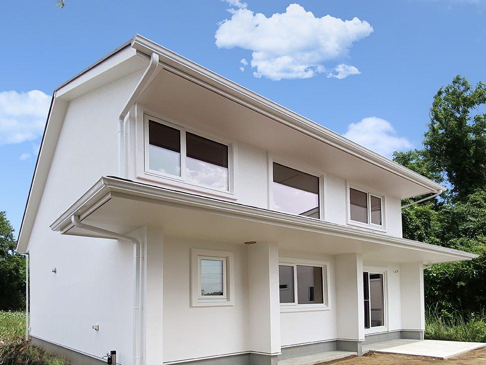 白い外壁と窓枠に赤系のお屋根のコントラストが美しい、高機能な住宅が完成しました。