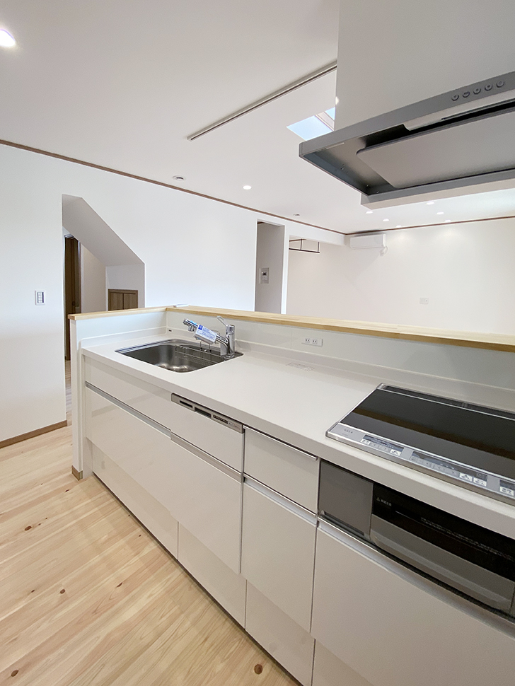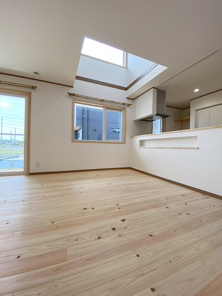 部屋全体のナチュラルな木目×白壁と自然になじむキッチン。