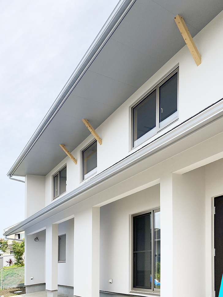 深い軒のテラス、美しい白い壁。