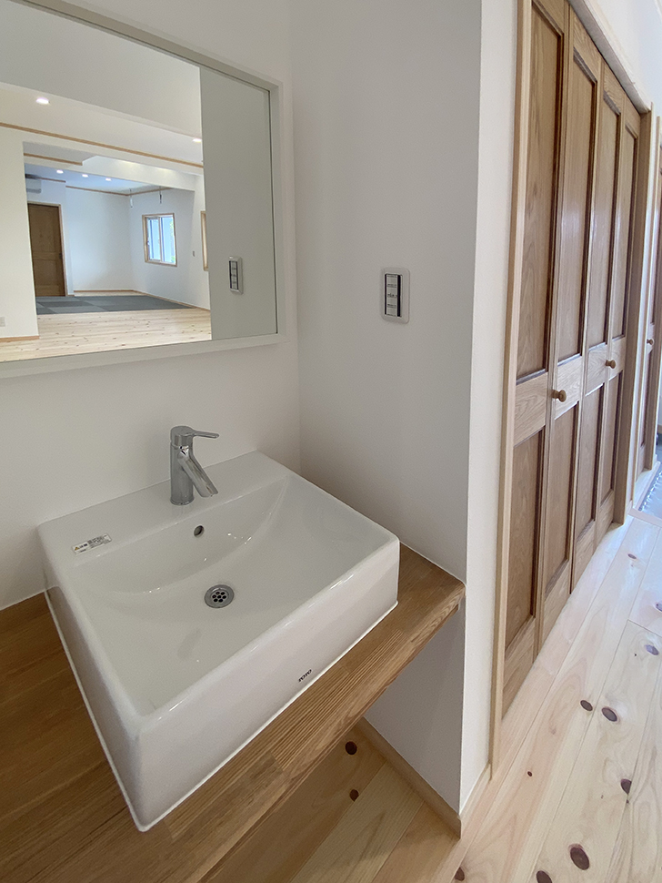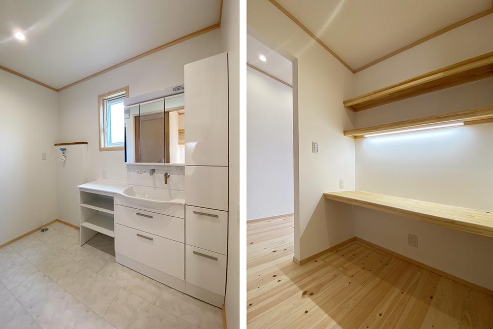 キッチン横の広い収納スペースへ真っ直ぐ入ることのできる玄関や、帰宅後にすぐ手洗いのできる洗面コーナーなど、暮らしへの工夫が詰まっています。
