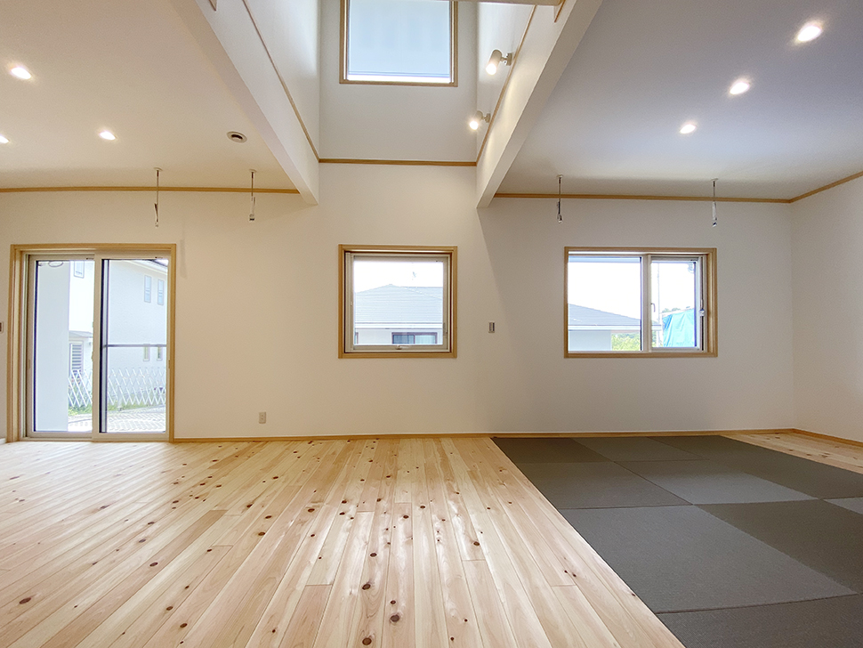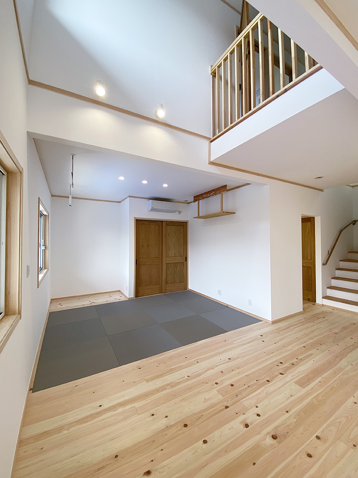 明るい吹き抜けのあるLDKには、畳のコーナーを設えました。