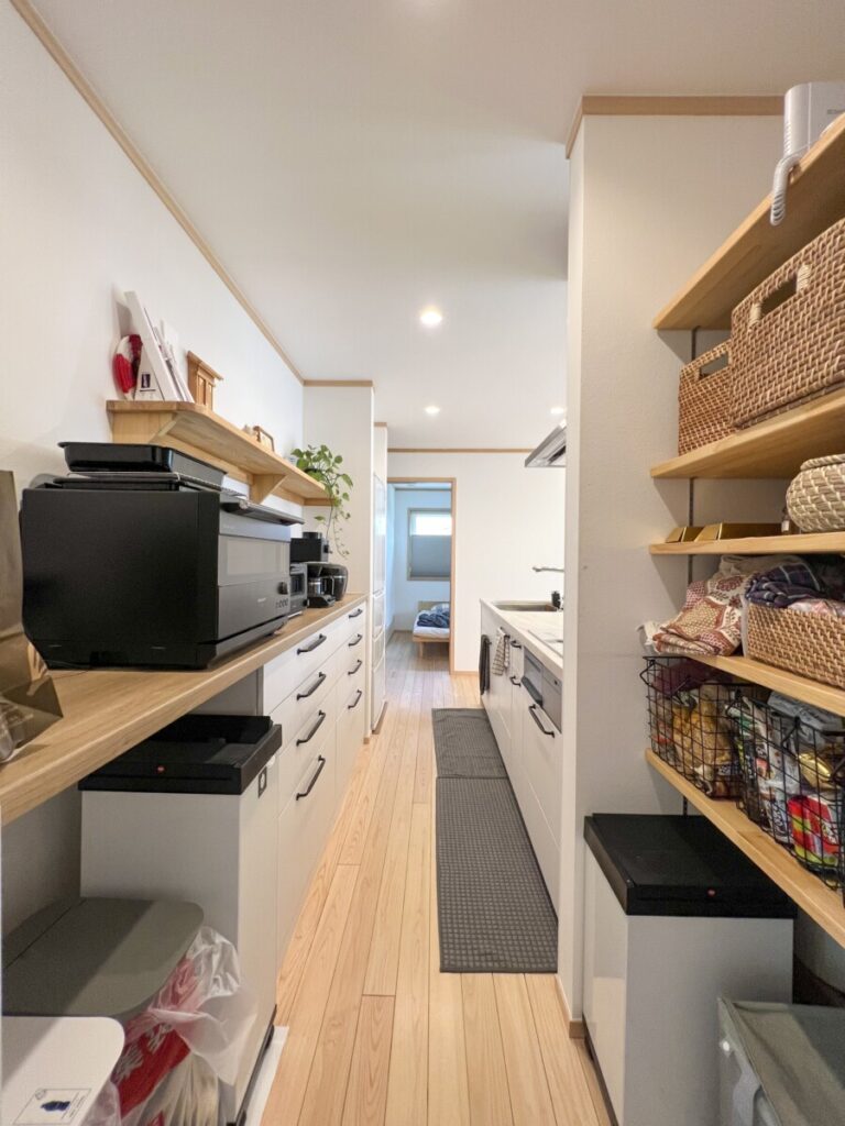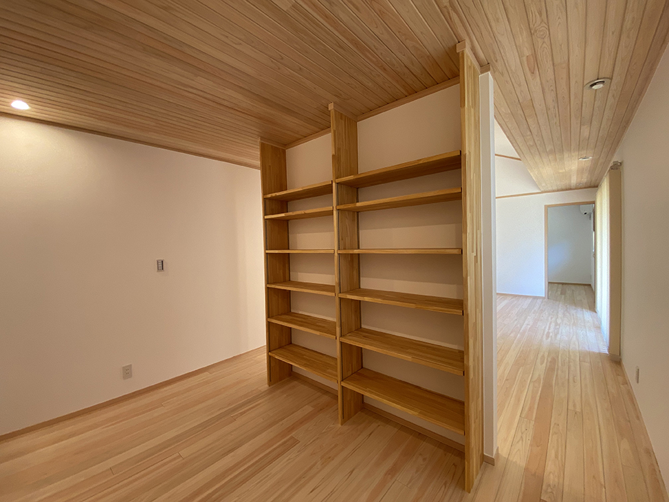 造り付けの収納棚は天井までたっぷり収納できる。
