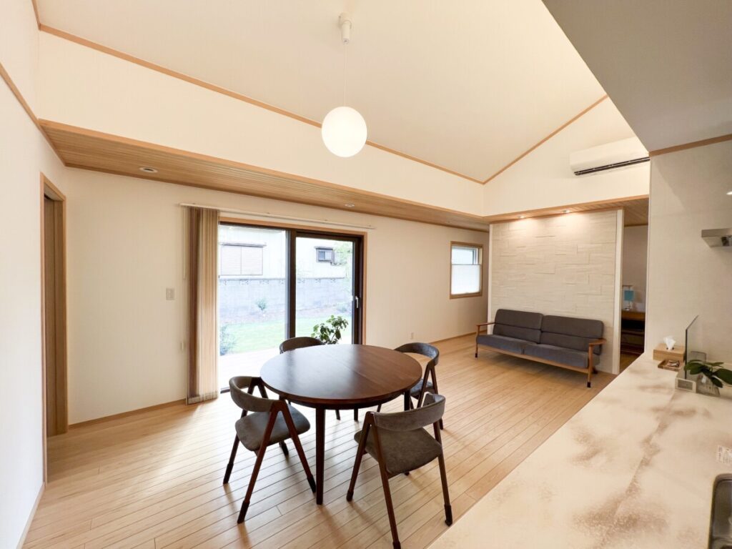 屋根勾配を生かした高い天井のリビング。