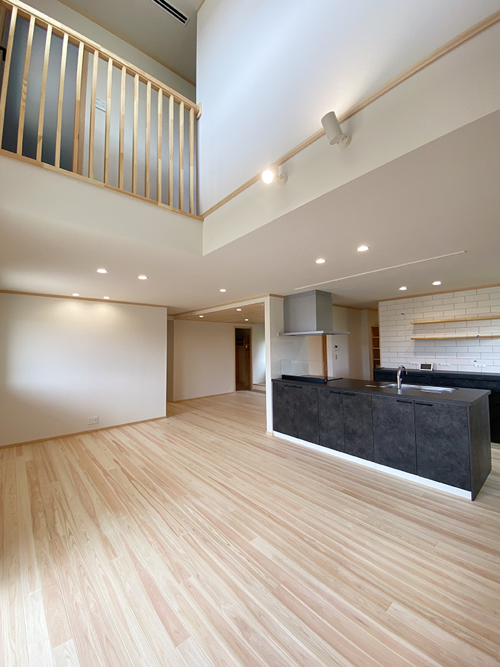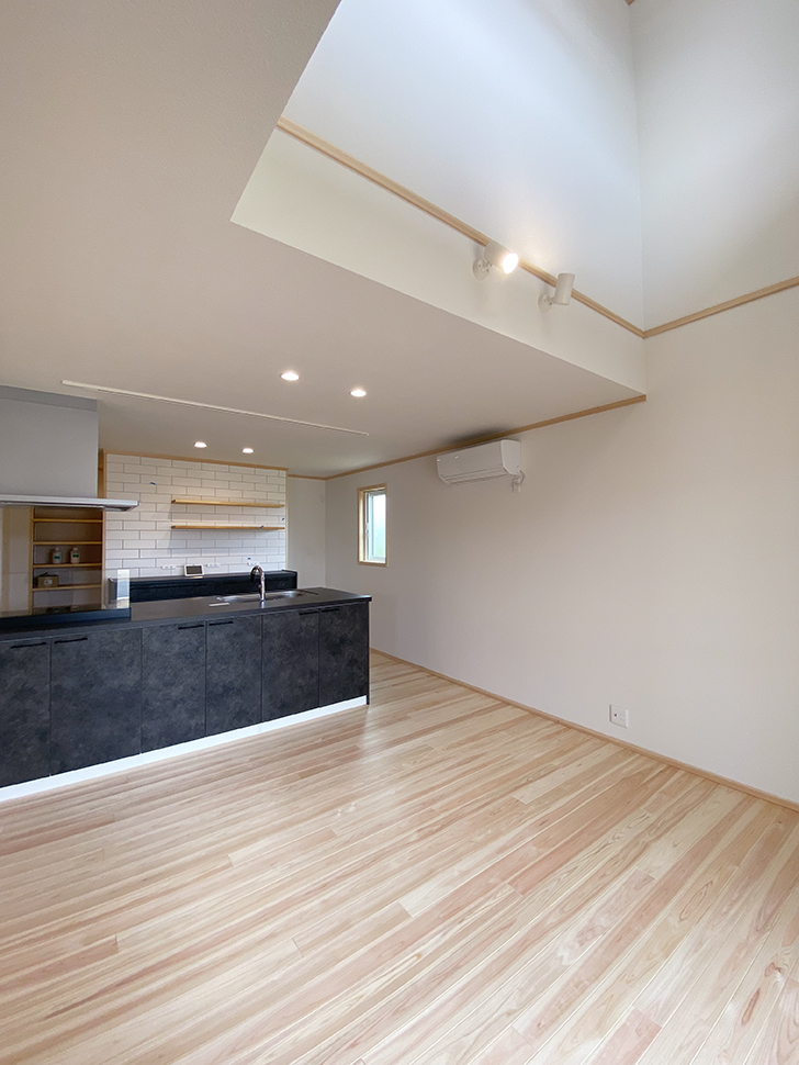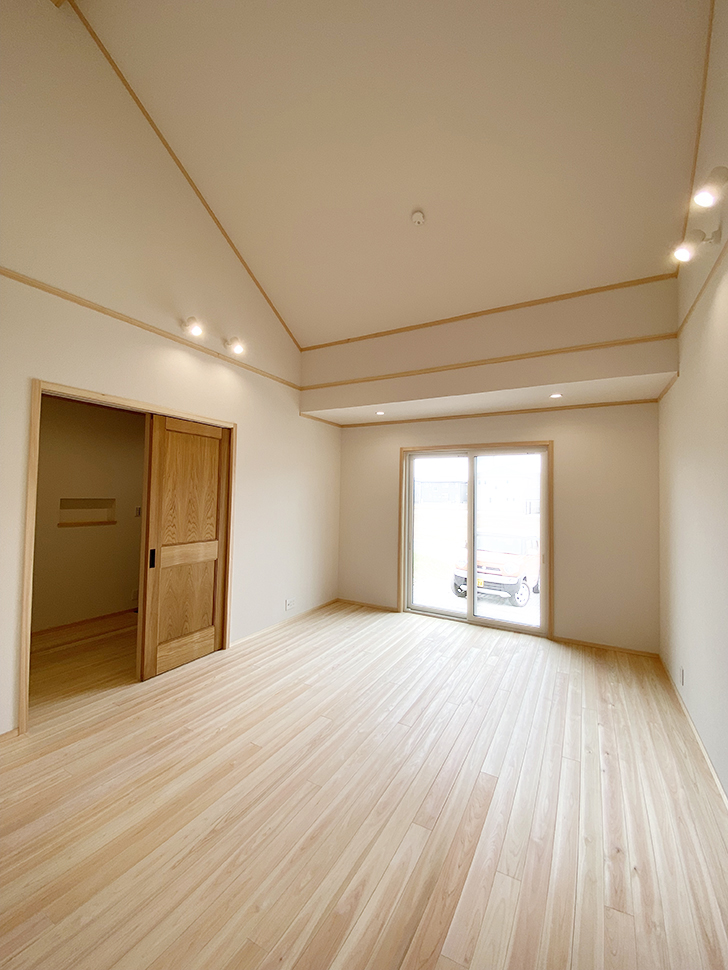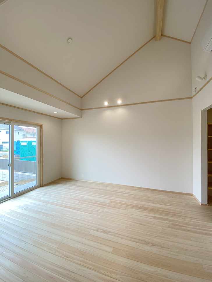 屋根形状を生かした高い天井が開放感あふれる居室。