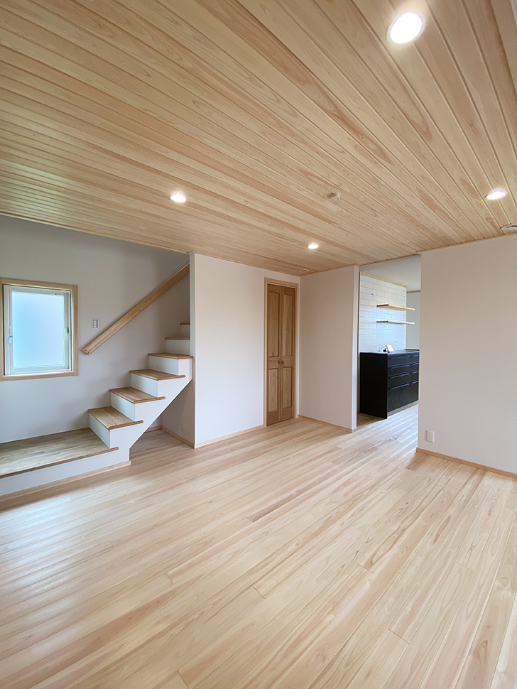 爽やかなお色の外壁と広いポーチ、LDKの天井に桧を板張りしたデザインのお家です。