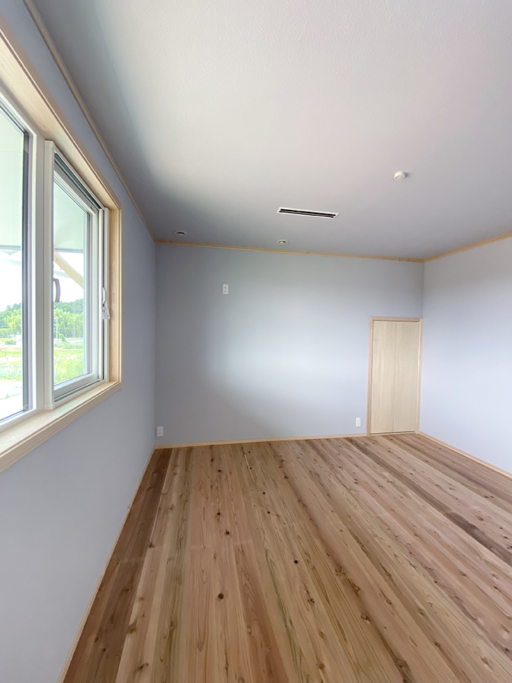 美しいブルーの壁紙のお部屋に、将来的に2部屋に仕切って使うこともできるお部屋。