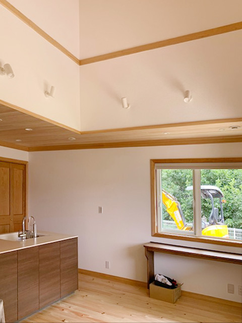 開放感あふれる吹き抜けのダイニングは、勾配天井部に桧の羽目板を使用。