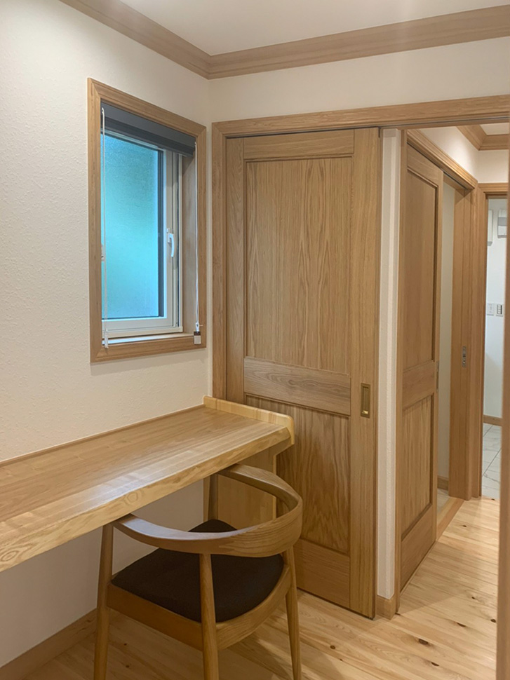 寝室側、リビング側のどちらからでも行き来でき、家族で使える書斎。