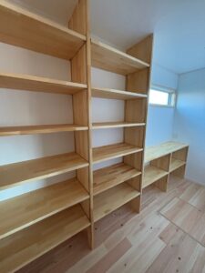 キッチンでは、奥様とお打合せしながら決めた寸法で、カップボード上部に棚を取り付けました。日々の使いやすさを想像しながら、一つひとつの“ちょうどいい高さ”“必要な収納量”を形にしています。