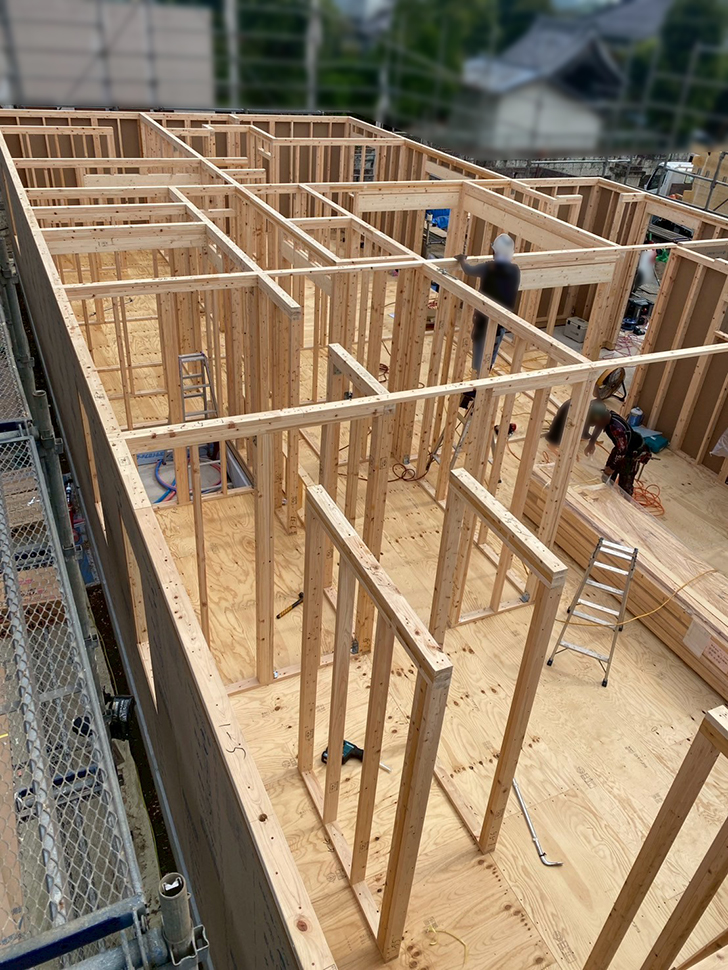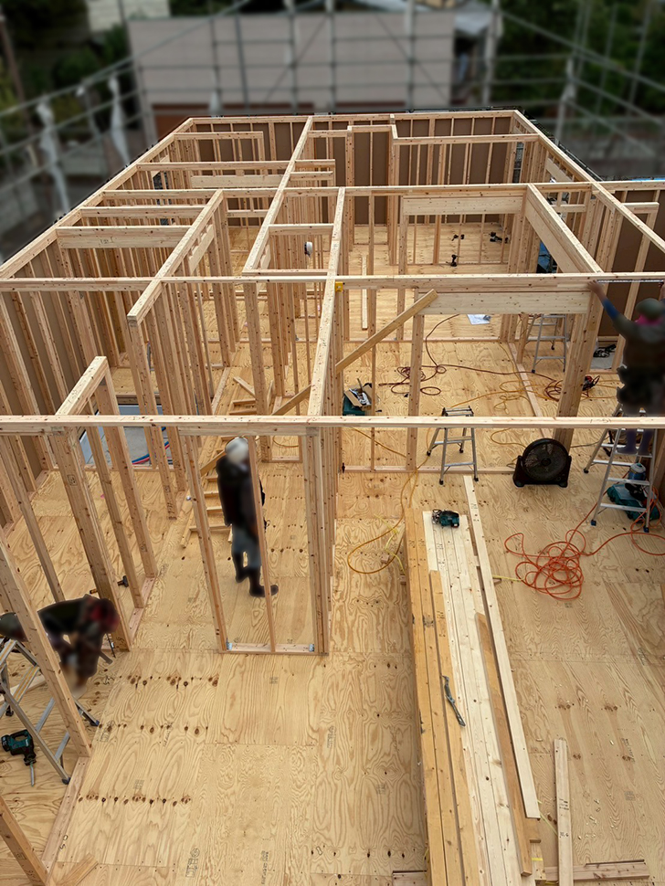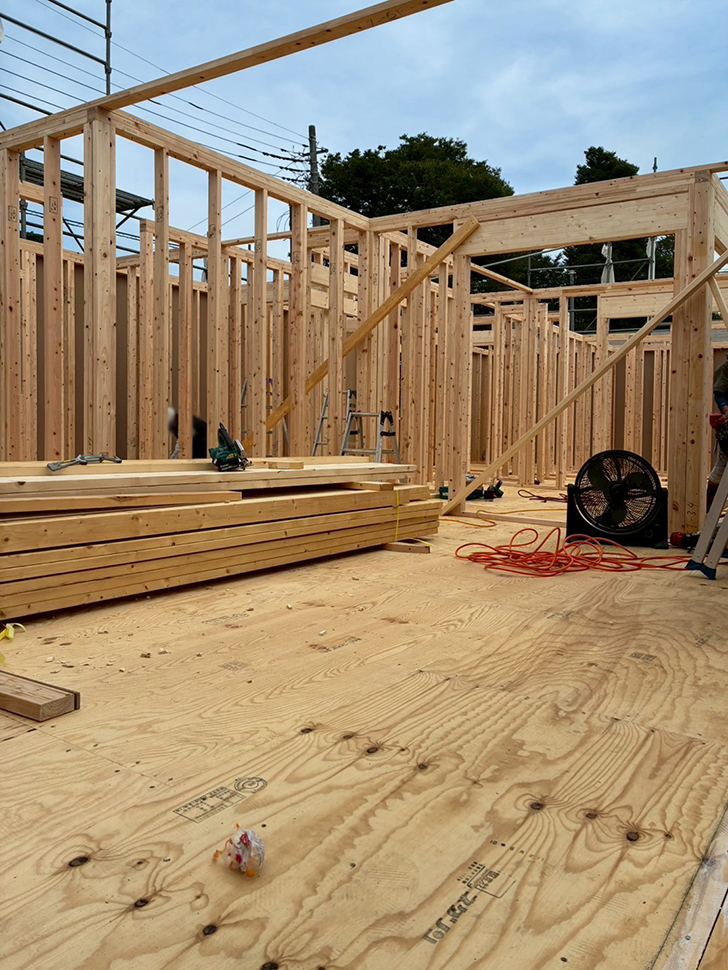 雨に濡れるリスクを避けるためTo Casaでは建て方を二日間で完了させ、ルーフィングまで仕上げます。