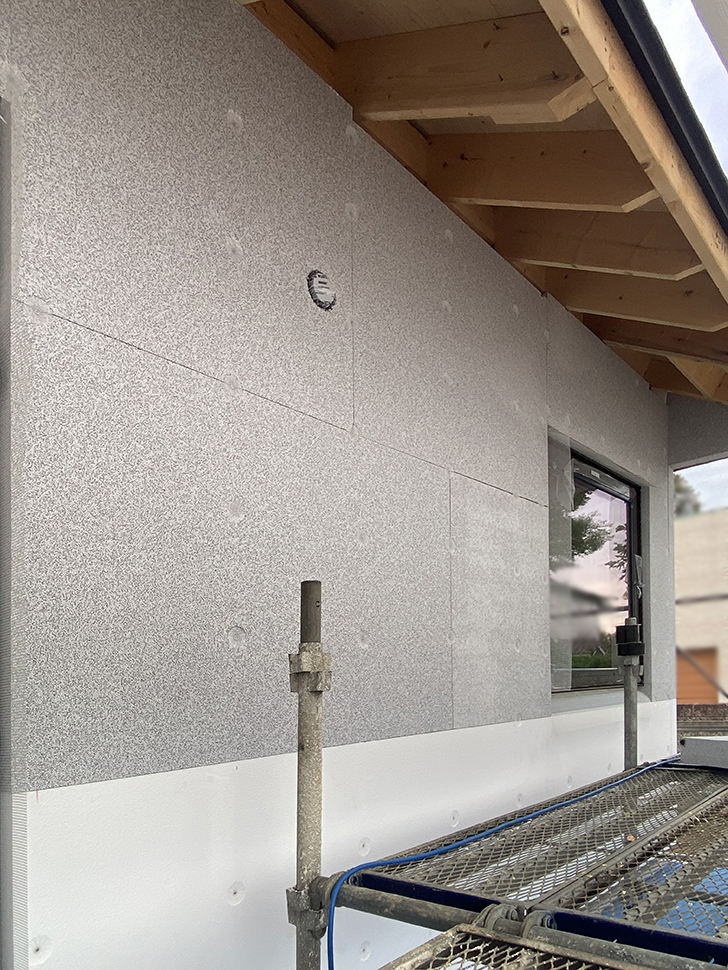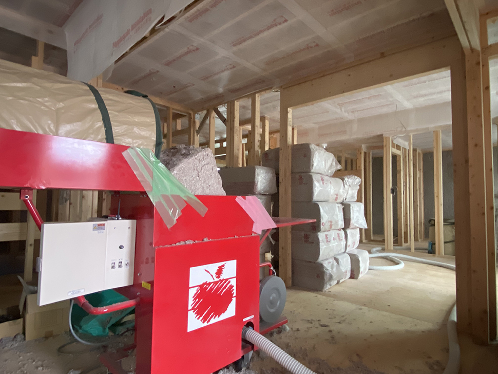 このお家の断熱にはセルロース断熱材を使用し、外周部の断熱には100mmのEPSボードを使用します。
