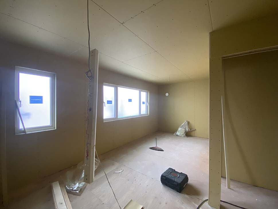 セルロース断熱工事が完了した室内では石膏ボードの施工が始まっています。