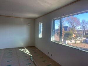 室内には石膏ボードが取り付けられ、桧の床貼り工事が進んでいます。