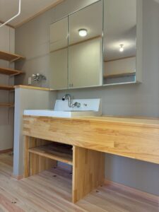 お客様こだわりの造作洗面台です。大工さんと設備屋さんのコンビネーションです。