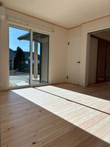 温かみのある自然素材の桧の床です。現在養生ボードで隠れていますが、冬でも皆さん素足で歩いているほど暖かいとおっしゃっています。