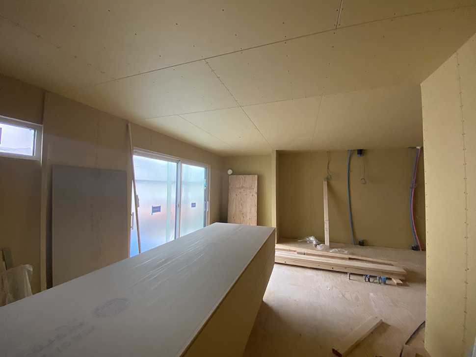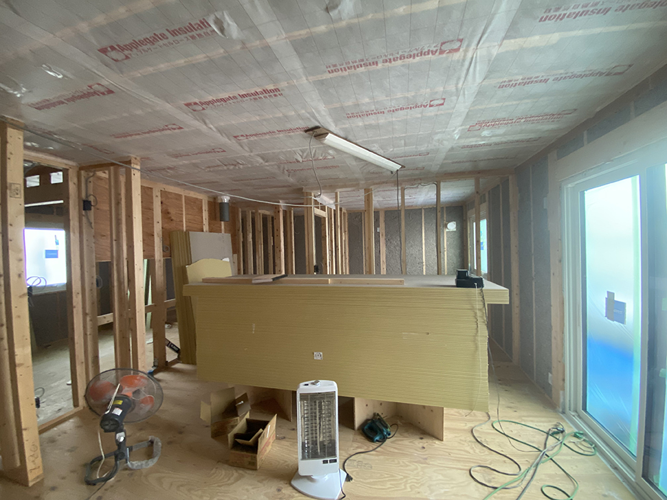 セルロース断熱工事が完了した室内では石膏ボードの施工が始まっています。