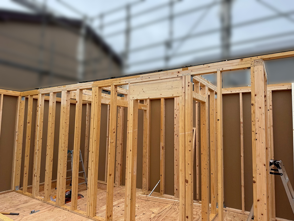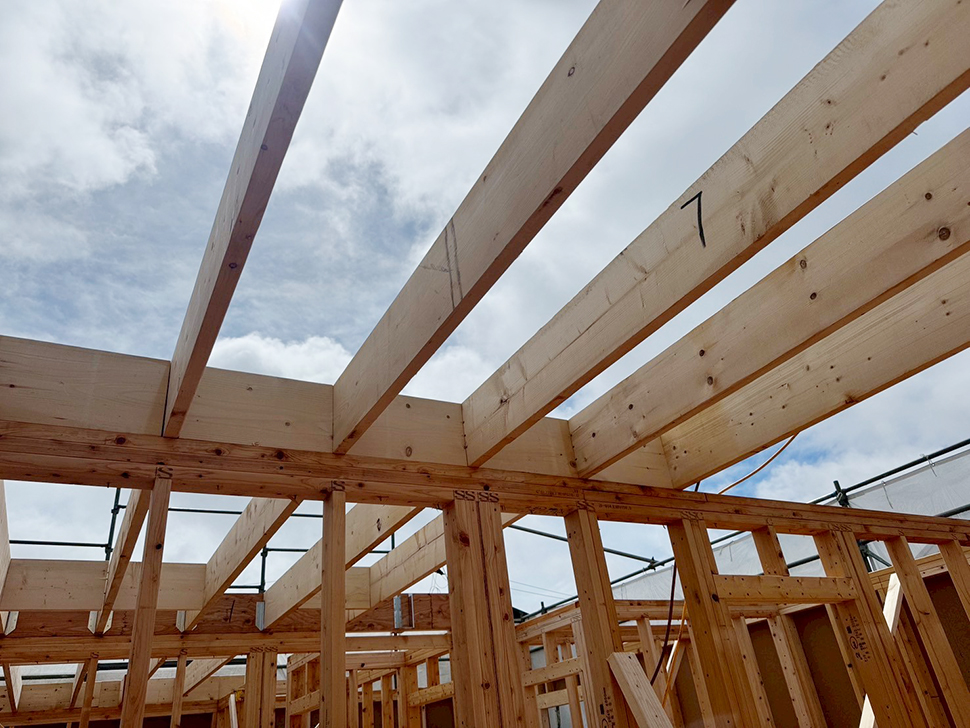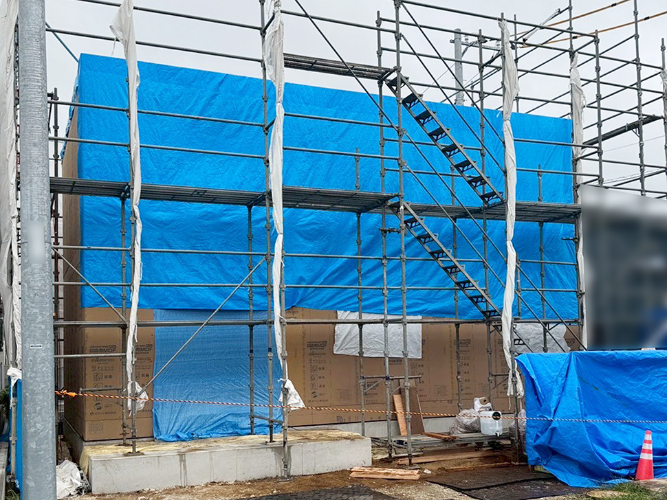 雨の予報が出ていたため、しっかりと雨養生をした上での建て方二日目の様子をお届けします。