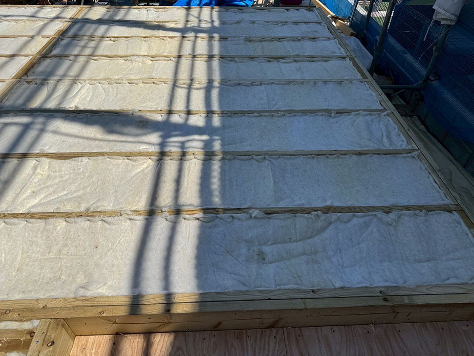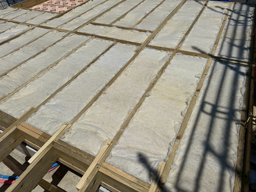 床断熱に羊毛ウールを入れた状態の写真です。自然素材の羊毛断熱材です。
