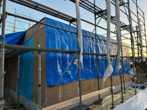 1日目は2階の床の工事にて、雨養生ブルーシートをかけて終えました。