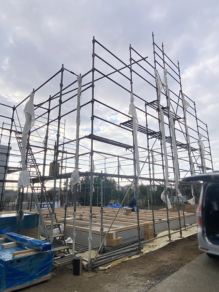 足場も組まれました!防蟻性も考え、桧の土台を使用しています。大工さんは土台を切った後の木の小口にも防蟻材を塗布し、細かいところまで気を付けます。基礎工事完了した際、配管の周りなど防蟻コーキングを使用して工事をします。
