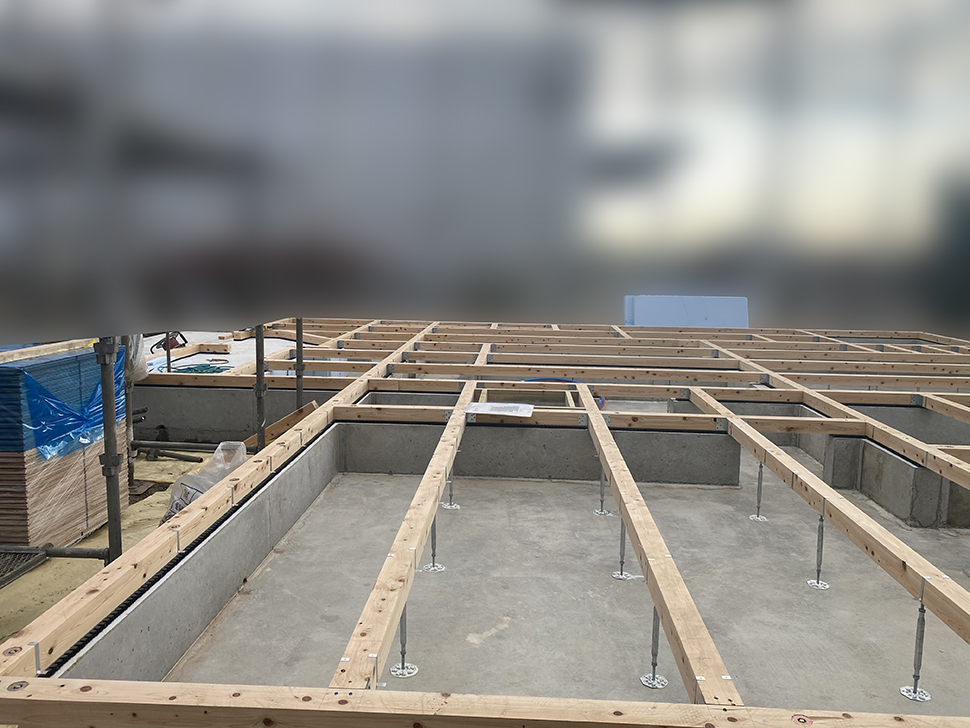 「自然素材と漆喰 大屋根の家(取手市)」の基礎工事が完了し、建て方へ向けて土台工事が行われています。