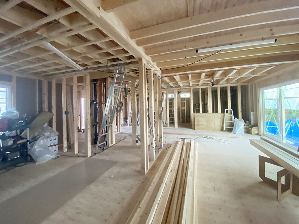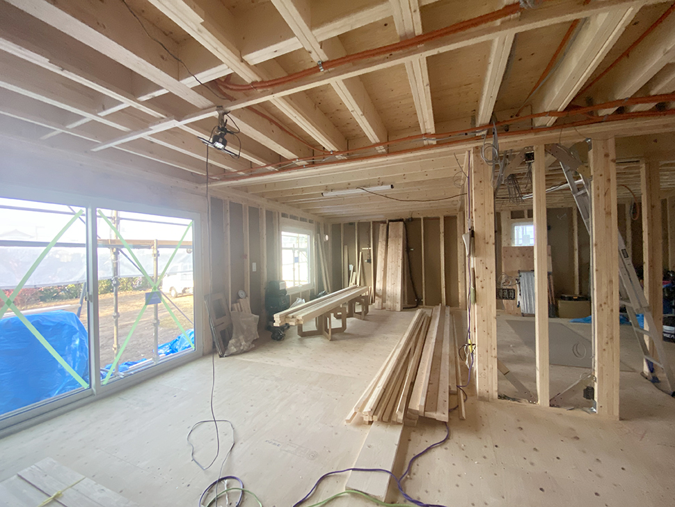 広々とした室内。制震ダンパーも取付完了し、自然素材をふんだんに使用したお家になります。